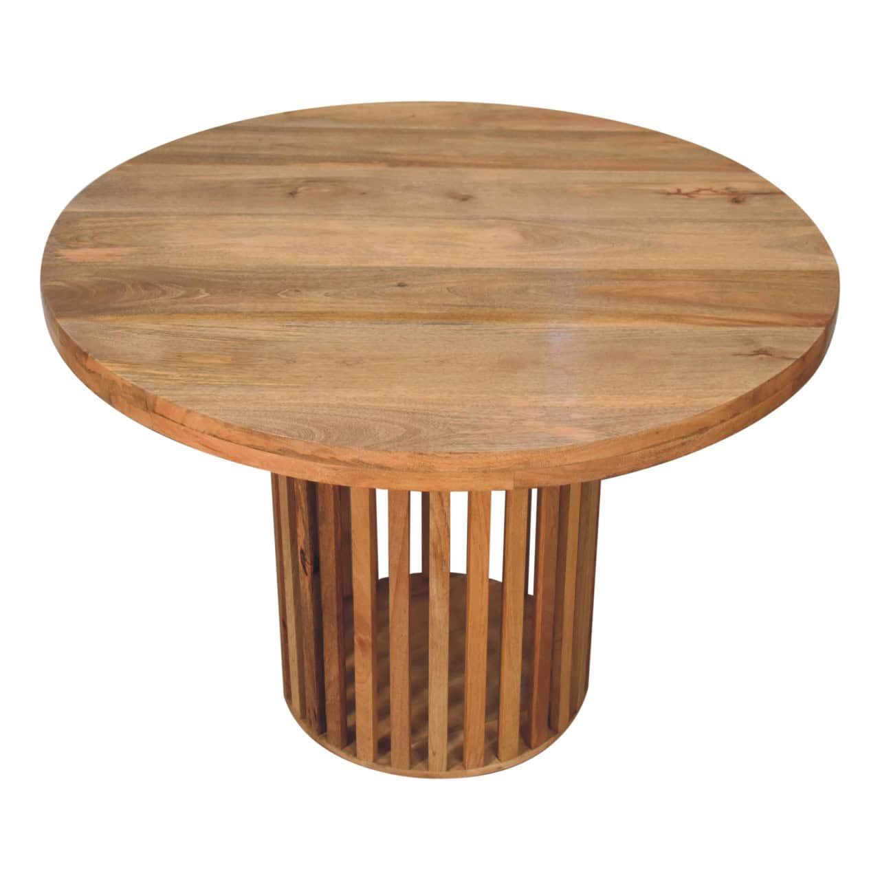 The Ariella Round Dining Table brings a modern Japanese-inspired design to your home, allowing light to shine through its sleek structure. Constructed from 100% solid mango wood in an oak-ish finish, this table is perfect for family dinners and gatherings. Its unique design adds a contemporary flair, making it a standout piece in any dining room.