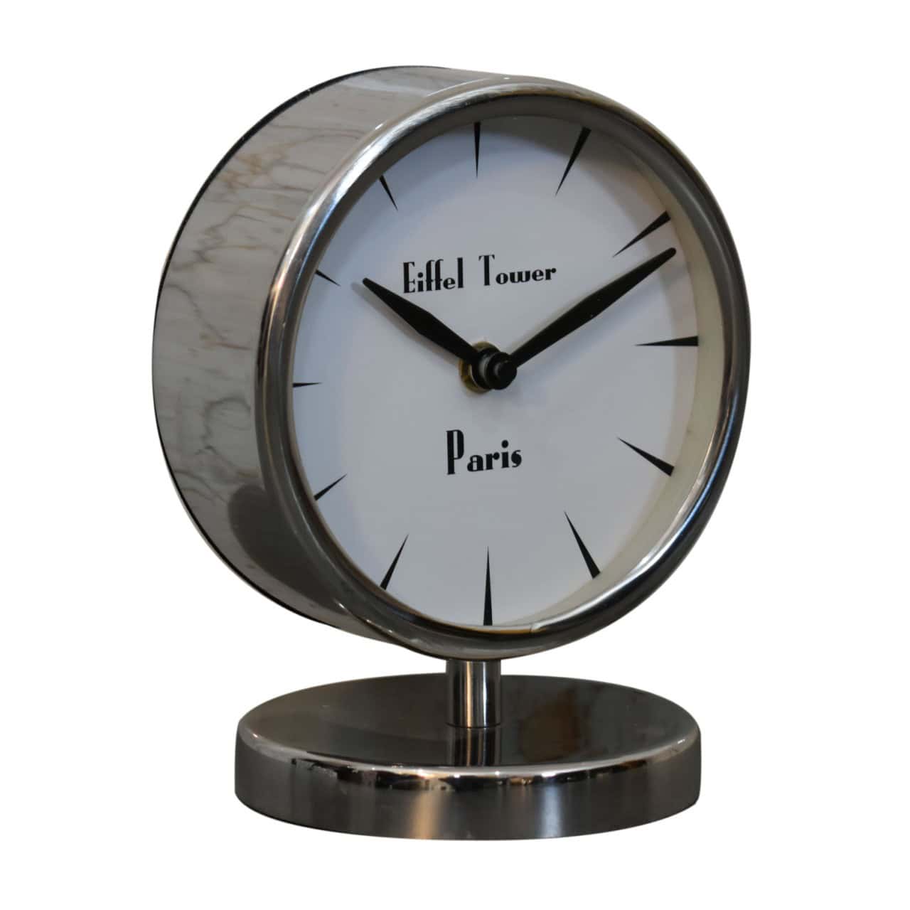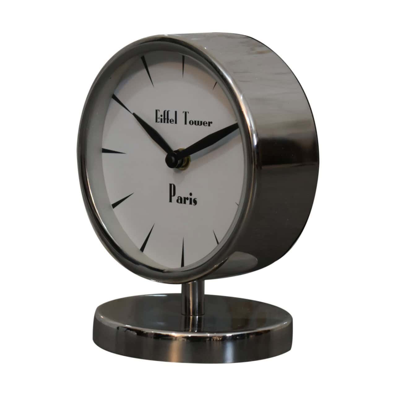 The Chrome Table Clock with White Face offers a minimalist look with its sleek round design and chrome frame. The simple white face and chrome accents make this clock a versatile addition to any modern décor, perfect for a bedside or desk.