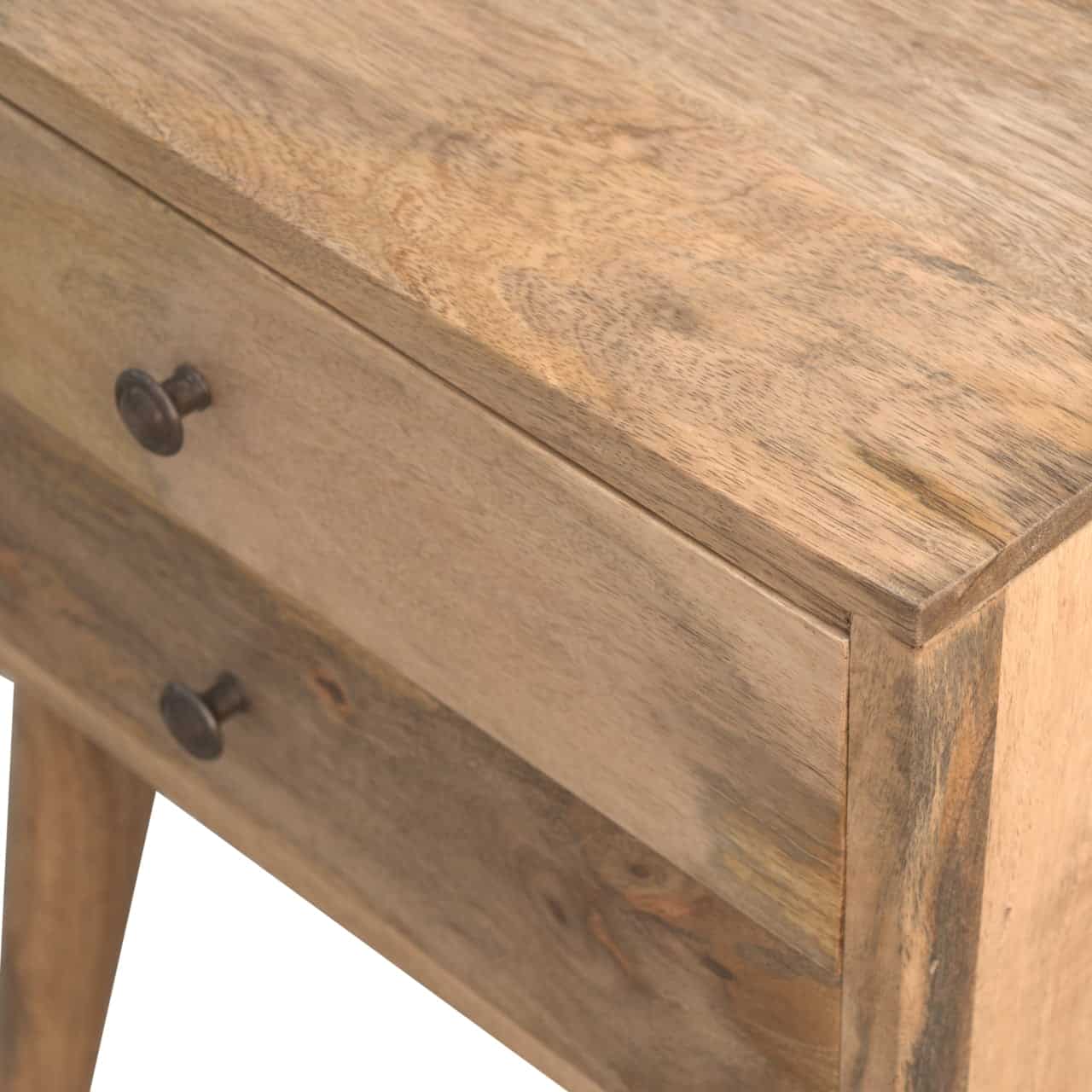 The Modern Solid Wood Bedside is the epitome of minimalist elegance. Crafted from 100% solid mango wood with a fine oak-ish finish, this versatile table complements any space. With two spacious drawers featuring shiny knobs and sturdy Nordic-style legs, it provides both style and practicality. Whether you need a stand for your lamp, nibbles, or drinks, this piece effortlessly fits into any room of your home.
