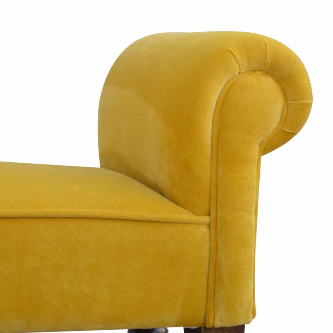 Add a bold splash of color to your home with this Mustard Velvet Bench. Upholstered in vibrant mustard yellow cotton velvet, it features turned legs crafted from 100% solid mango wood in a walnut finish. Ideal for hallways, bedrooms, or as extra seating in living areas, this bench combines comfort with eye-catching style. Its bright, cheerful hue and elegant craftsmanship ensure it stands out as a beautiful accent piece while offering functional seating in any room.