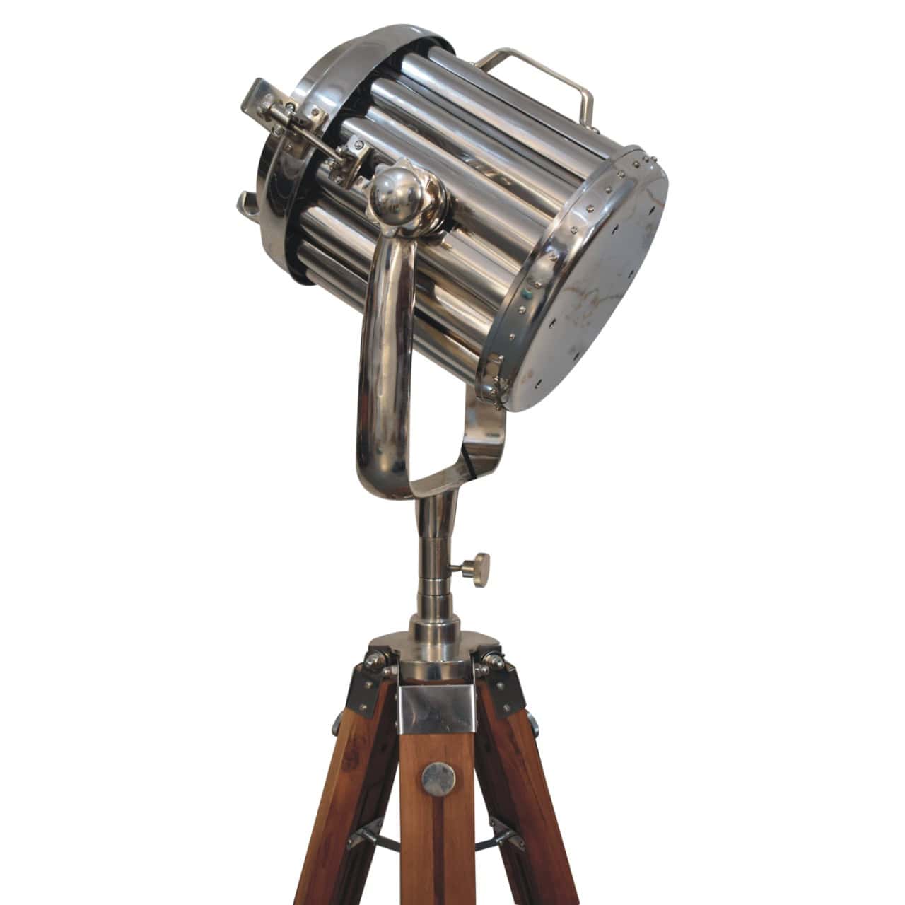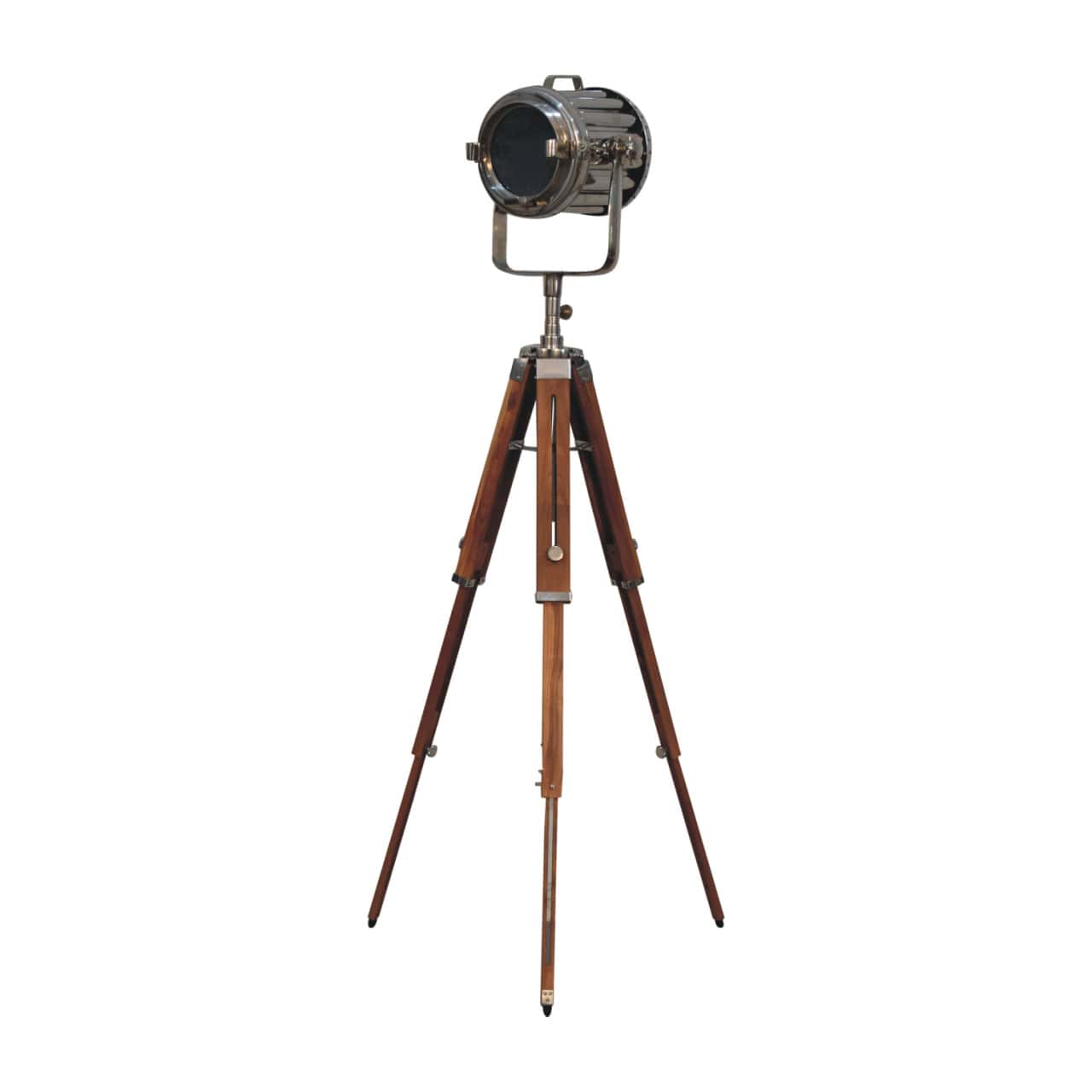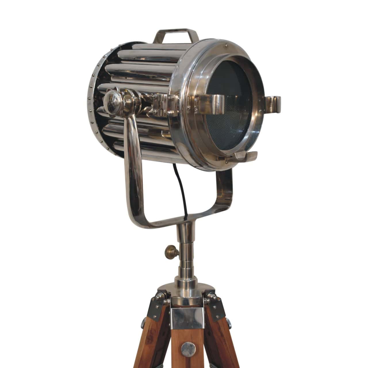 The Netted Chrome Spotlight Floor Lamp is an iconic statement piece for any home. With its matte brass spotlight head and natural tripod legs, this handcrafted lamp adds a bold, industrial touch to your living space. Each piece is unique, showcasing natural variations in finish and texture, making it a one-of-a-kind addition to your decor.