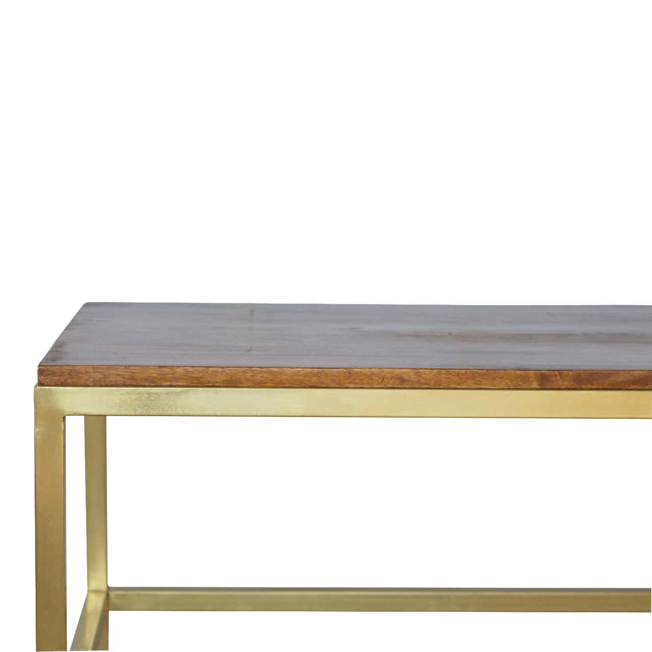 The Rectangle Gold Coffee Table makes an industrial statement with its refined design and brass-finished legs. Topped with a smooth chestnut-finished solid mango wood surface, this table is perfect for showcasing modern or industrial decor. Its sleek, rectangular shape ensures it fits seamlessly into any living space, providing both style and function.