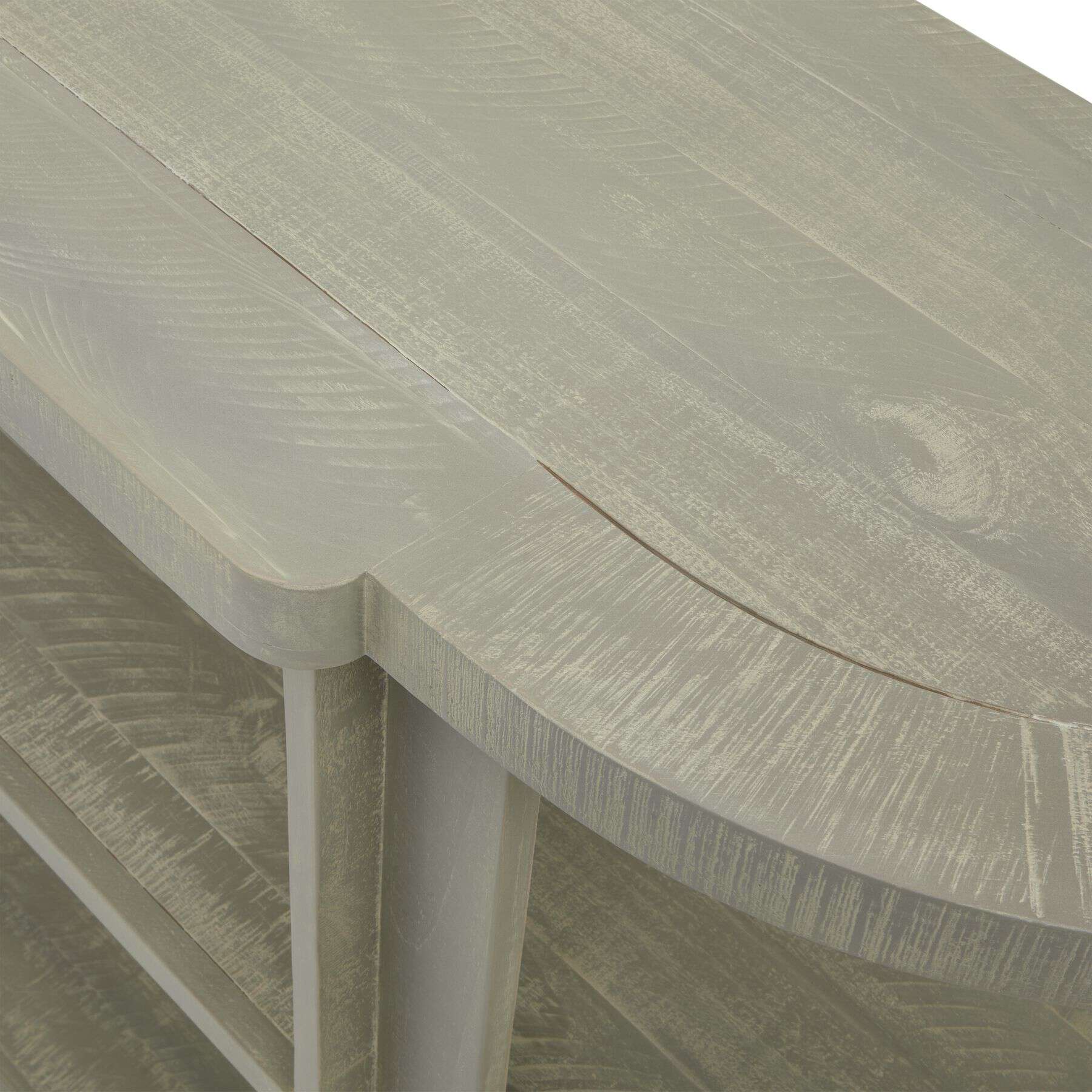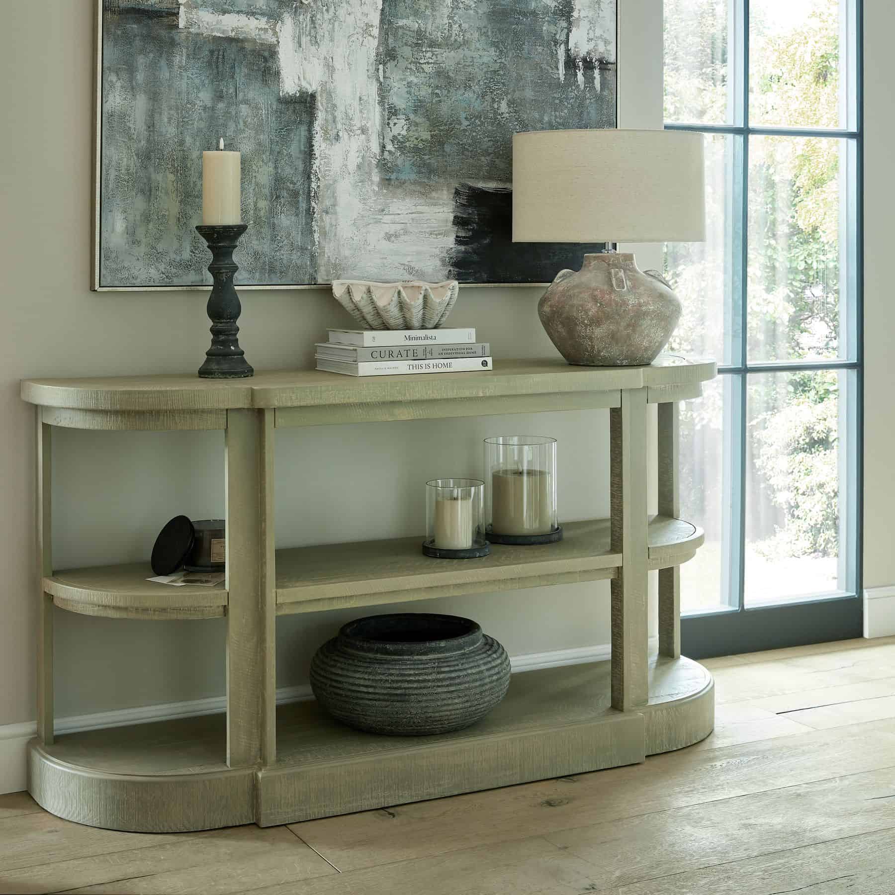 The Saltaire Collection 2 Shelf Console Table offers both function and style with its weathered wood finish and soft curved outlines. The pared-back design creates a modern yet timeless aesthetic that fits seamlessly into any interior. Perfect for displaying decorative items, this console table is a must-have for those looking to add a touch of sophistication to their space.